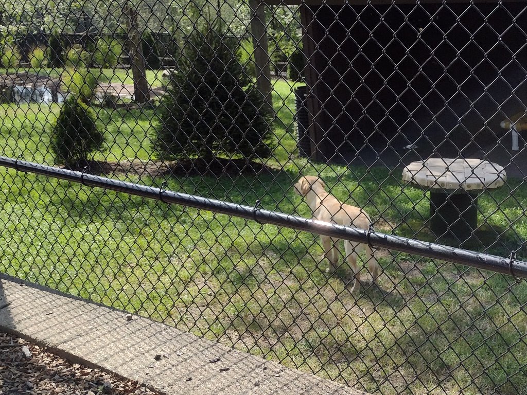 One of the most curious exhibits was the Animal Ambassadors exhibit, on its own stretch of land roughly in the middle of the zoo. This one was home to a cheetah named Nandi and an adorable golden lab named Bowie. Apparently, for orphaned kittens, domestic puppies make fantastic surrogate siblings. Nandi had darted off before we could get a picture of her, but Bowie wasn't in any rush, so we were able to get one of him.