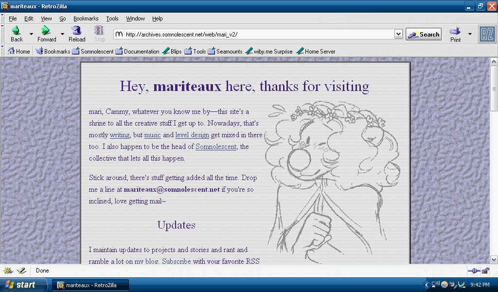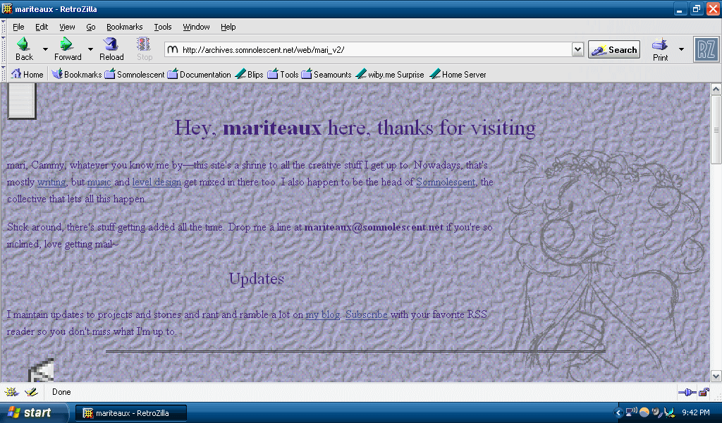 I also did some work patching some of our old sites on archives.somnol. I take a very "post what was intended, not what was scraped" approach with archives. We make mistakes, things don't necessarily work right, and part of what I do when I move stuff to archives is optimize PNGs, speed up asset loading, and fix any broken scripts or dead links. I want them to be authentic, but I don't care so much about accuracy. If anything, a page that works better than when it was originally scraped is just more pleasing to browse.