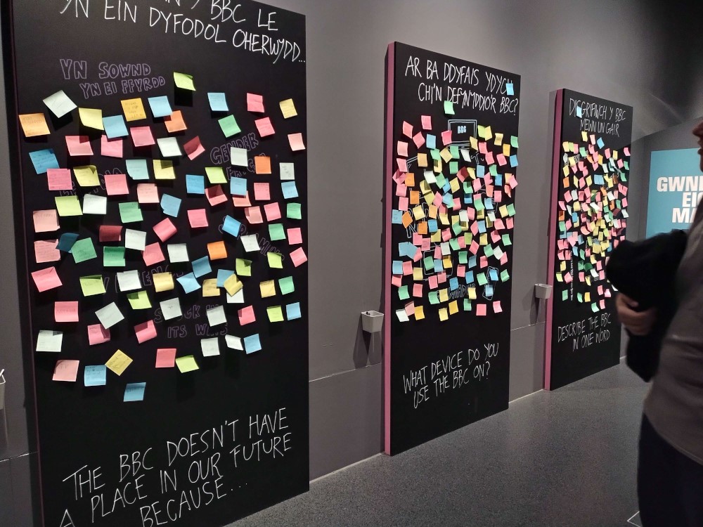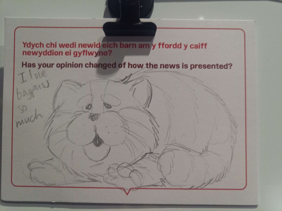 Towards the end of the exhibit, there were these boards with pens and stickie notes sitting next to them asking the people visiting what they thought the BBC does best, what it does worst, what they'd miss if it were gone, that sorta deal. These were glorious, because although they had security there trying to clear off any joke answers, they were still effectively real-life shitposting boards. Cramble used his aggressive height to put the stuff he wrote (damned if I could remember what, but it was funny) well out of reach of the security guards, and Caby drew a Bagpuss for each and every one of the boards.