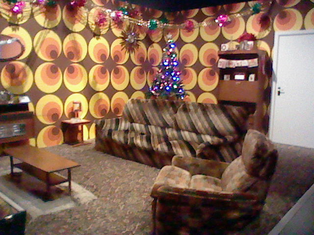 There were a few mini-rooms in the exhibit, which was great. One that Caby and I loved was this hideously loud 70s living room at Christmas with a striped couch and circle patterns on the wall, complete with a period record player, TV, and bright red radio in the back. It was awful. I would have this in my basement if I had a basement.