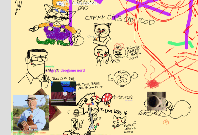 Since we weren't able to have a call on day sixteen, we decided to have a make-up call that more people could attend that night. The group played more Gartic Phone, and someone discovered another activity called Jamspace, which allows everyone to doodle on a big virtual whiteboard. The results were, well, chaotic.
