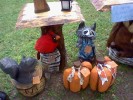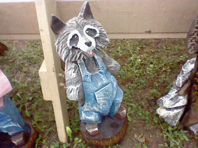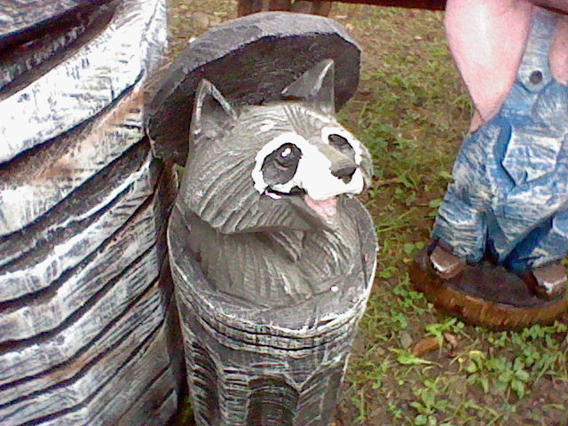The old chainsaw carver guy retired last year! Very glad we got to see him, he had a real nice stage presence and played classic rock while he worked. The new guy wasn't quite as charismatic, and sadly no music, but he was still super talented with that chainsaw. They carve out all these garden decorations right in front of you, and on the final day, they auction them off to the community. I bet they go for some hundreds of dollars apiece, so we'll never own one, but they sure are cute to look at. Lookit the raccoon in the trash can!