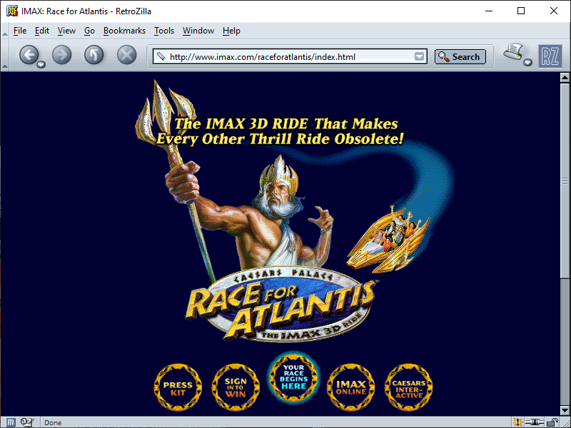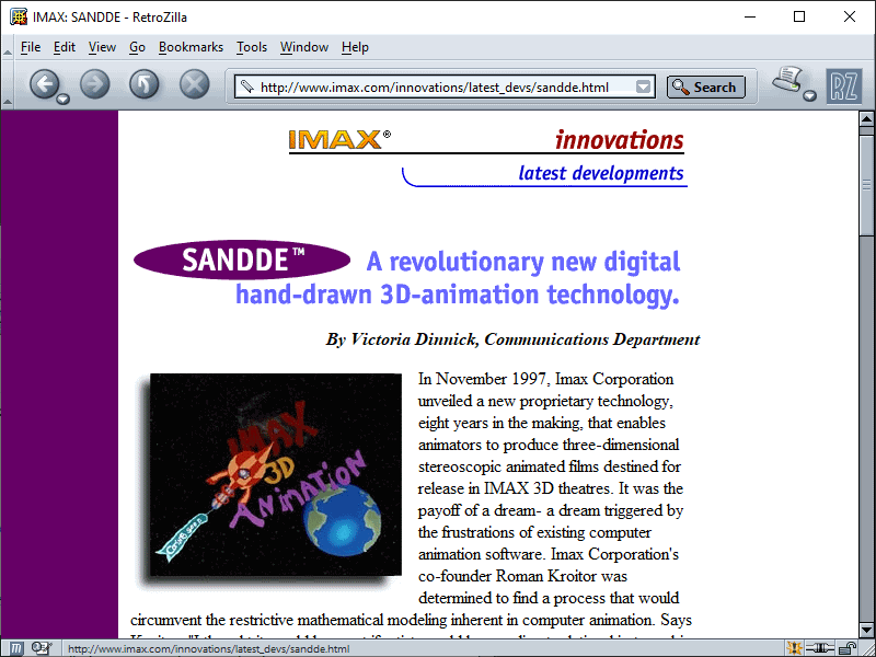 I was looking for a good first site to restore since joining the Protoweb team, and the IMAX site from 1998 (thanks to JackNet in the Discord for the suggestion) stuck out to me for being incredibly well-preserved. If you've ever used the Wayback Machine, and if you're interested in Protoweb, I'll assume you have, you know full well how commonly images and entire pages go missing from its grabs. imax.com had, not counting a few subsites that were too nibbled to be usable, perhaps a dozen images across the entire site that needed to be recreated. The rest were all accounted for. Every last page deep in the "Innovations" section? Present in full. Even among the subsites, the ones for T-REX: Back to the Cretaceous and Race for Atlantis were, like a fossilized Pteranodon skull, nicely preserved and nearly perfect. Even the company's financial records in vintage 90s PDF form were completely intact!