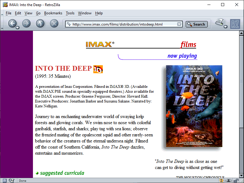 This is a big site, and there's lots to see on it. If you like movies, there's a lot about IMAX's technical achievements, including IMAX Dome, where the film is projected onto a big dome in front of, above, and around the audience, and the ways they were converting their big-screen, 3D movies into attractions and simulator rides that shake, rattle, and roll the seats as the action gets hot on screen. You can even see, with imagemaps of world maps, which IMAX theaters were present around you at the time! (In my limited research, a lot of them are still there too, which is cool.) Happy browsing, folks!