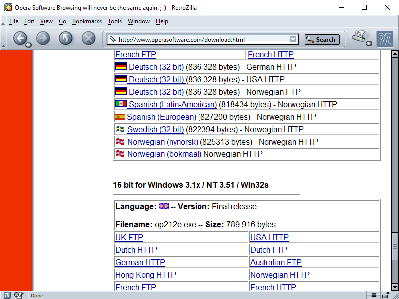 I actually came back to this restoration to find I'd done most of it already. I started this one back in 2024 (thanks to trey26 in the Discord for the suggestion), but gave up on it for a couple reasons, not least of which was the lack of early Opera versions floating around online. I managed to scrape together the English 32-bit version and a German 32-bit copy of 3.23, but there were also French and Italian versions and 16-bit variants of all the above, plus the mirror still had 2.12 available in 16- and 32-bit English, German, American and European Spanish, Swedish, and two flavors of Norwegian (where Opera was based out of). I felt without all the rainbow of versions Opera was offered in, the site would be only half-complete.