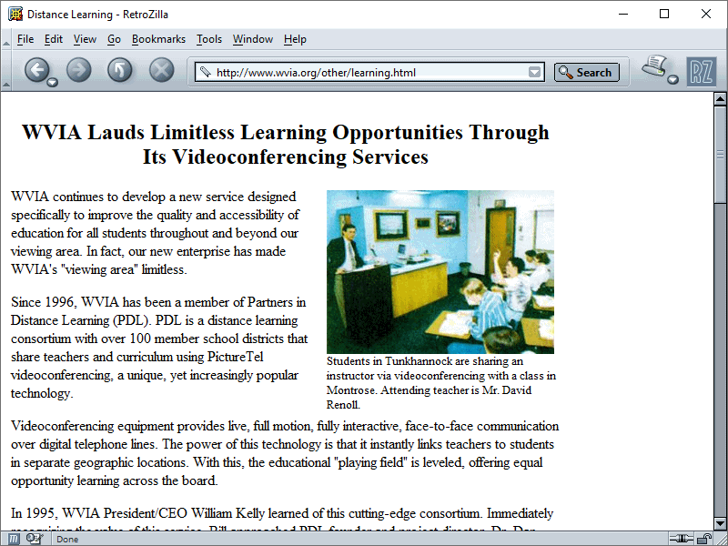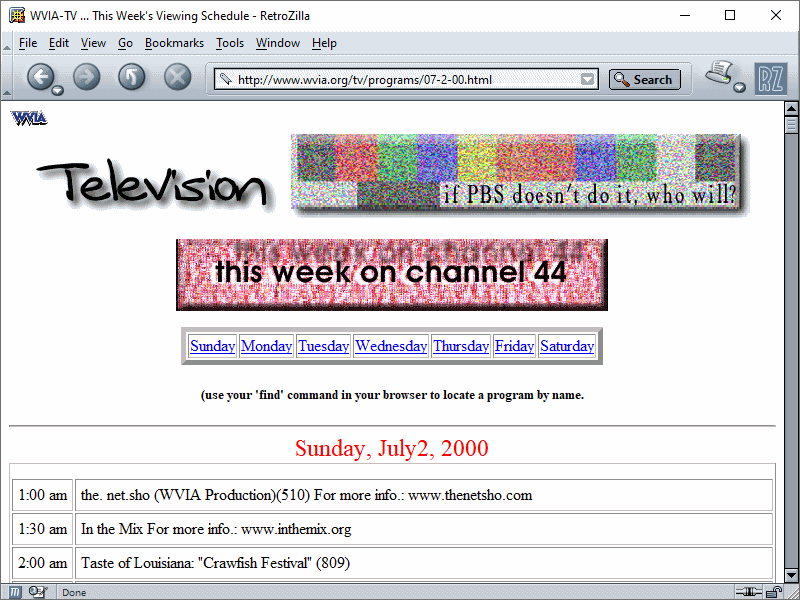 wvia.org was in excellent shape. I feel like this site mirrors how I feel about PBS as a whole--it's a lot of plain text and images, maximally informational on niche topics even if the presentation is kinda boring, and as a wordy, boring, niche person, I appreciate that. Of the site, you can see the fantastic hair and mustaches on the then-station staff, check out some to-the-minute detailed old program listings for both the TV and radio halves of WVIA (and yes, you will find Red Dwarf in there, often overnight, and I so wonder what episodes they were airing), look through the programs the station was producing on everything from eclectic jazz mixes to a show all about that newfangled Internet thing, and even read about WVIA's videoconferencing services, long before remote was an everyday part of education.